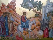 На следующий день после вечери в Вифании Господь отправился в Иерусалим, город, избивающий пророков. Но Иерусалим был не только обиталищем жестокосердых фарисеев, надменных книжников и первосвященников-богоборцев; это был невиданный людской муравейник, огромный стан паломников и богомольцев. Во время Пасхи в Иерусалиме было почти столько же человеческих душ, сколько и в Риме, тогдашней столице мира. Сия необозримая людская масса собиралась в Иерусалим, чтобы быть ближе к Богу. Нельзя сказать, что сердце не соблазненной народной массы не является прозорливым. В том случае и в тот день оно воистину ощутило удивительную близость Божию и прозрело в Господе Иисусе Христе вожделенного Царя из колена Давидова. Потому, когда Господь спускался по горе Елеонской, этот народ восходил на ту же самую гору в сретение Ему. Одни постилали свои одежды по дороге пред Ним; другие резали ветви с маслин и прочих дерев и ими украшали путь; третьи для цели сей намеренно избирали пальмовые ветви; и все вместе, исполненные радости, приветствовали Господа восклицаниями: осанна! благословен грядущий во имя Господне, Царь Израилев! Вопреки железному гнету римскому, вопреки развращенности и партизанской мелочности своих старейшин, душа народная веровала в возможность чуда Божия, кое полностью и мгновенно изменит невыносимое положение. И народная душа почувствовала: носитель этого чуда – Господь Иисус Христос. Потому Его и приветствовали так радостно. Как Он произведет сию коренную перемену в положении вещей, народ не ведал; он был так воспитан, что знал только один способ осуществить эту перемену, а именно, с помощью царя из колена Давидова, который воссядет на престоле Давидовом в Иерусалиме. Оттого-то народ видел в Иисусе сего царя и приветствовал Его с радостью и надеждою, что теперь Он воцарится в Иерусалиме вопреки Риму и вопреки Иерусалиму. Однако эта вера народная вызвала страх у фарисеев; и эта радость народная вызвала у них гнев. Потому некоторые из фарисеев сказали Христу, да запретит им восклицать так. А кроткий Господь, ведущий непреоборимость силы Своей, ответил им: сказываю вам, что если они умолкнут, то камни возопиют. Такой ответ дал им Царь царствующих, переоблаченный в нищего и едущий на молодом осле. Ибо, по описанию евангелистов, Господь при сем величественном вхождении ехал на молодом осле.
